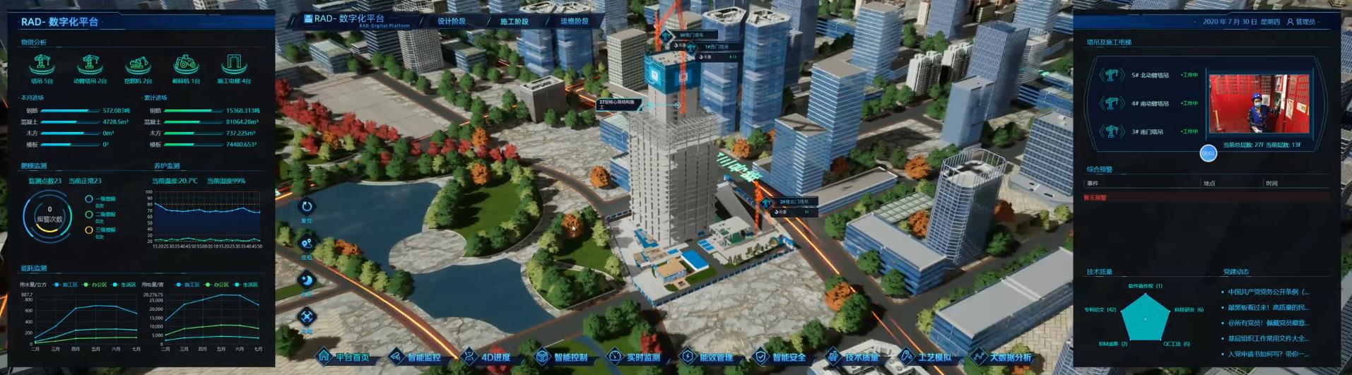 以 BIM 技術(shù)為核心,以數(shù)字化管控為目標(biāo),通過(guò)三維模型數(shù)據(jù)接口集成土建、鋼構(gòu)、機(jī)電、幕墻等多個(gè)專(zhuān)業(yè)模型,并將輕量化 BIM 集成模型為載體,搭建智慧建造一體化管控平臺(tái),為金域天小區(qū) PC 項(xiàng)目及滕家村商業(yè)綜合體兩大日照市重點(diǎn)項(xiàng)目的施工提供計(jì)劃進(jìn)度管理、質(zhì)量安全分析、能耗控制、環(huán)境監(jiān)測(cè)、消防安全資產(chǎn)定位、安防監(jiān)控、生產(chǎn)大數(shù)據(jù)分析等智能化管控措施,實(shí)現(xiàn)項(xiàng)目人員、設(shè)備、資產(chǎn)、安全等科學(xué)管理,讓項(xiàng)目施工管理更精益、更高效、更安全。智慧工地平臺(tái)將生產(chǎn)建造過(guò)程圖紙、文件等資料信息關(guān)聯(lián)模型,通過(guò)可視化漫游的方式將建筑結(jié)構(gòu)、水電暖通等各專(zhuān)業(yè)模型及資料同步呈現(xiàn),實(shí)現(xiàn)工程建筑的科學(xué)建設(shè)與精細(xì)管理。所有建造資料作為電子化檔案留存,無(wú)縫過(guò)渡樓宇運(yùn)維階段,實(shí)現(xiàn)建筑的全生命周期一體化管理。